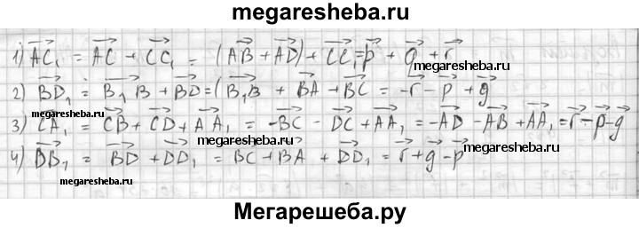 392. На трех некомпланарных векторах р = АВ, q = AD, г = АА, построен параллелепипед ABCDA₁B₁C₁D₁. Разложите по векторам р, q и r векторы, образованные диагоналями этого параллелепипеда.