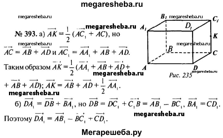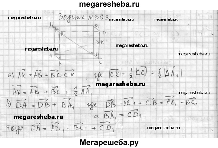 393. В параллелепипеде ABCDA₁B₁C₁D₁ точка К — середина ребра СС₁. Разложите вектор: а) АК по векторам АВ, AD, АА₁; б) DА₁ по векторам АВ₁, ВС₁ и CD₁.
