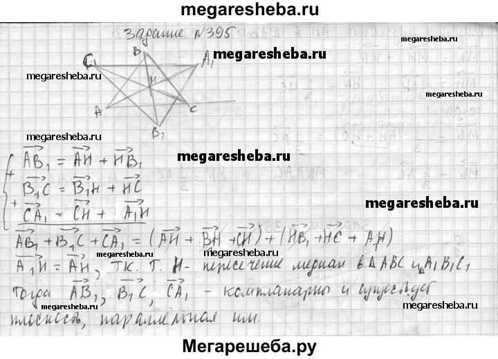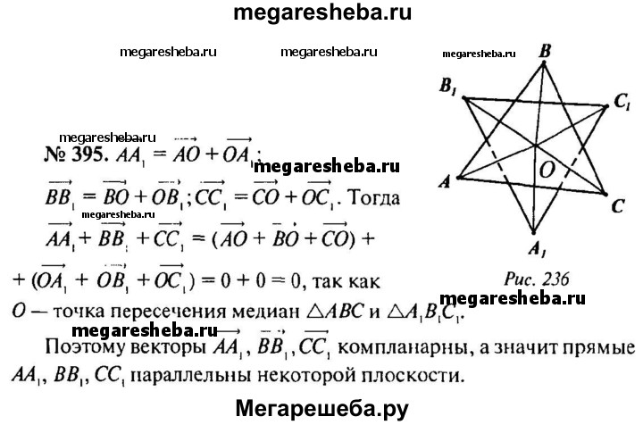 395. Докажите, что если точки пересечения медиан треугольников ABC и А₁В₁С₁ совпадают, то прямые АА₁, ВВ₁ и СС₁ параллельны некоторой плоскости.