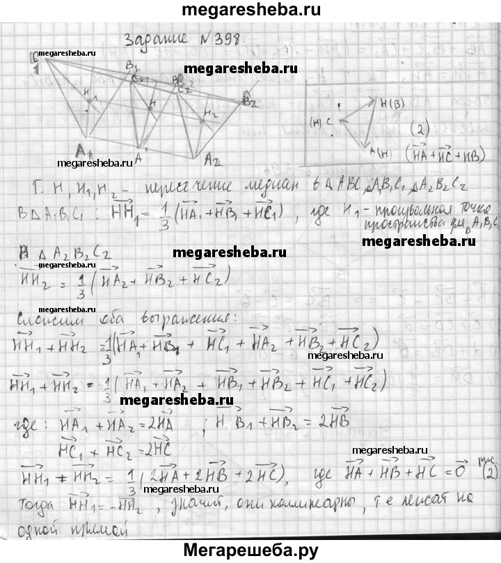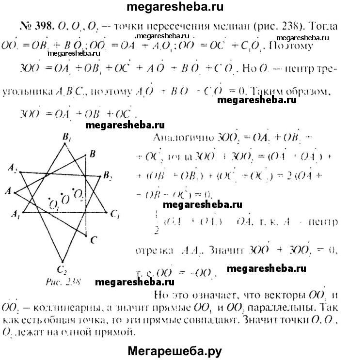 398. Треугольники ABC, А₁В₁С₁ и А₂В₂С₂ расположены так, что точки А, В, С являются серединами отрезков А₁А₂, В₁В₂, С₁С₂ соответственно. Докажите, что точки пересечения медиан треугольников ABC, А₁В₁С₁ и А₂В₂С₂ лежат на одной прямой.