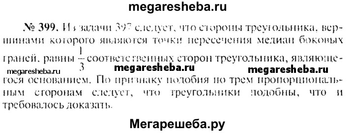 399. Докажите, что треугольник, вершинами которого являются точки пересечения медиан боковых граней тетраэдра, подобен основанию тетраэдра.
