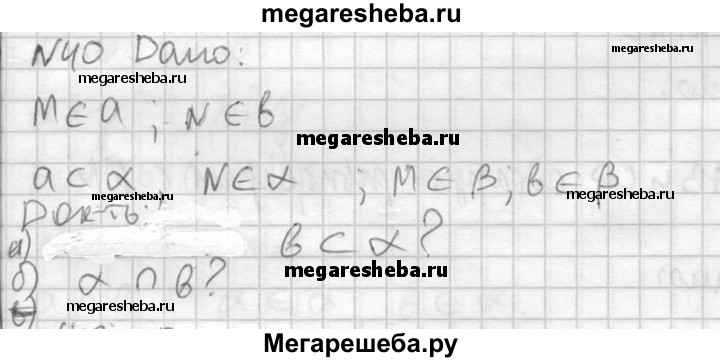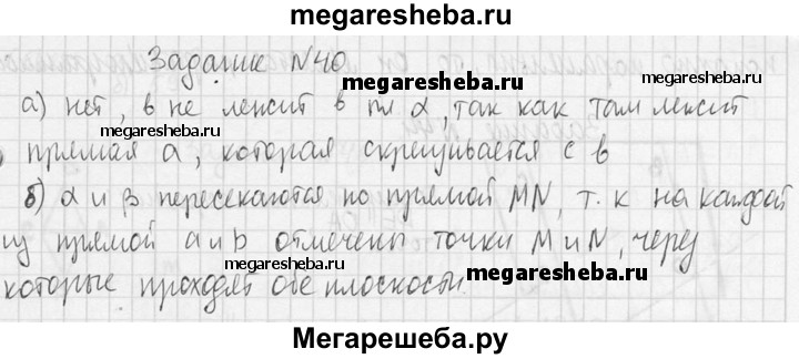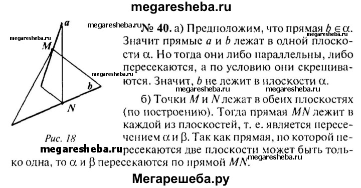 40. На скрещивающихся прямых а и b отмечены соответственно точки М и N. Через прямую а и точку N проведена плоскость α, а через прямую b и точку М — плоскость β. а) Лежит ли прямая b в плоскости α? б) Пересекаются ли плоскости α и β? При положительном ответе укажите прямую, по которой они пересекаются.
