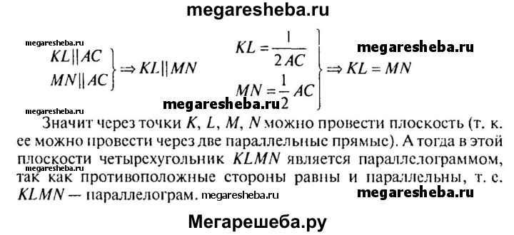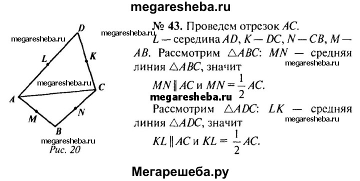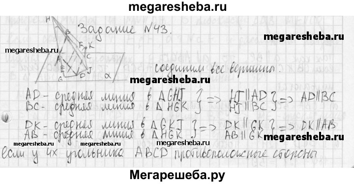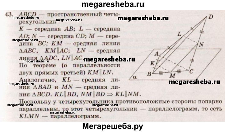 43. Докажите, что середины сторон пространственного четырехугольника являются вершинами параллелограмма.