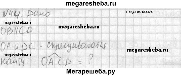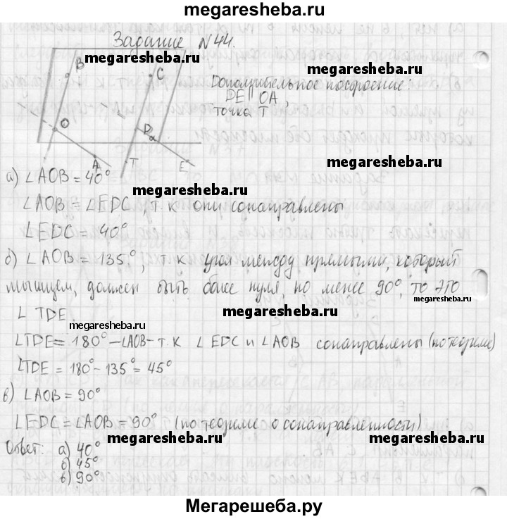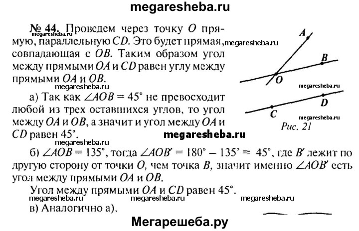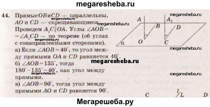 44. Прямые ОВ и CD параллельные, a OA и CD — скрещивающиеся прямые. Найдите угол между прямыми OA и CD, если: a) угол AOB = 40°; б) угол AOB = 135°; в) угол AOB = 90°.