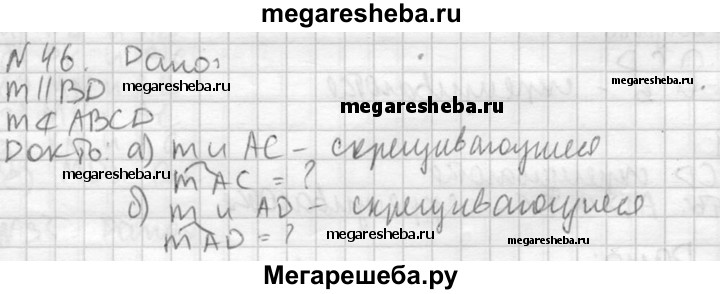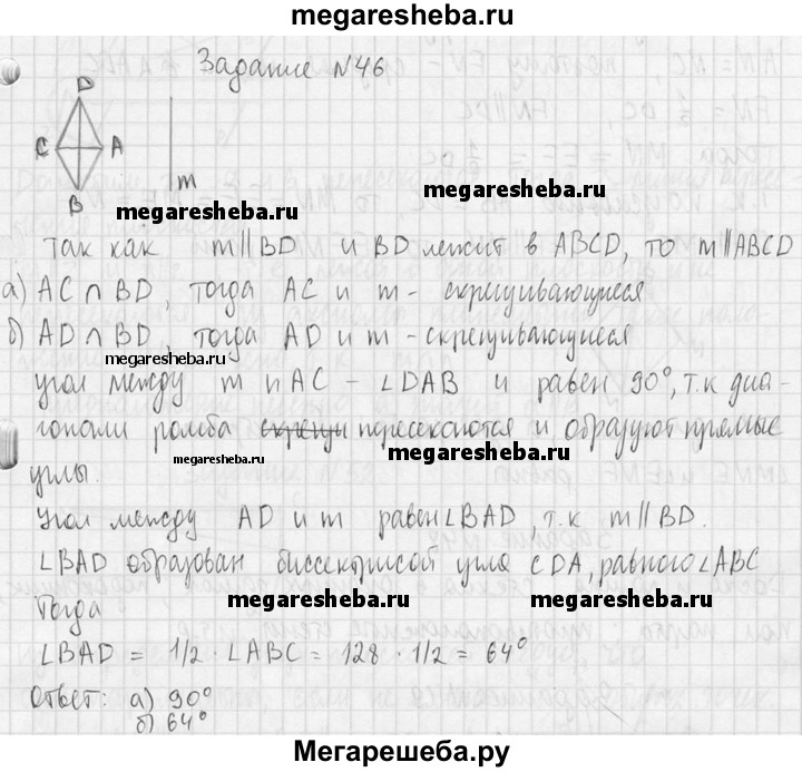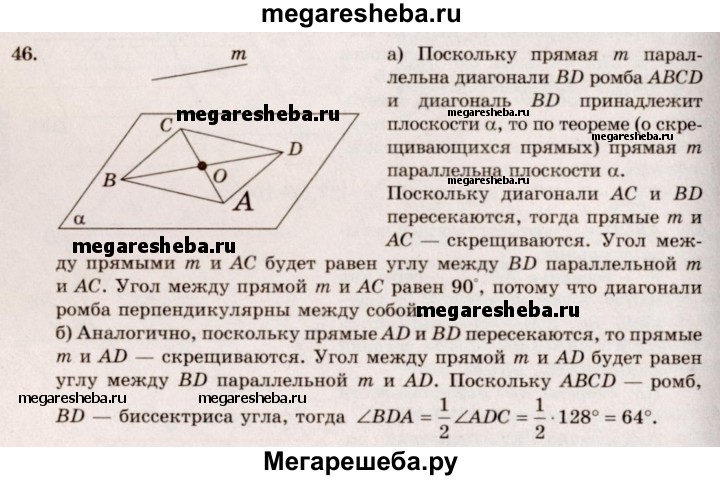 46. Прямая m параллельна диагонали BD ромба ABCD и не лежит в плоскости ромба. Докажите, что: а) m и АС — скрещивающиеся прямые — и найдите угол между ними; б) m и AD — скрещивающиеся прямые — и найдите угол между ними, если угол АБС равен 128°.