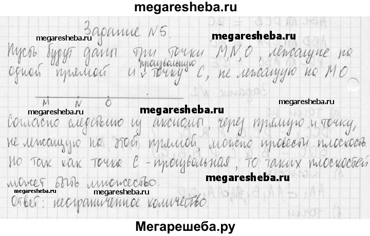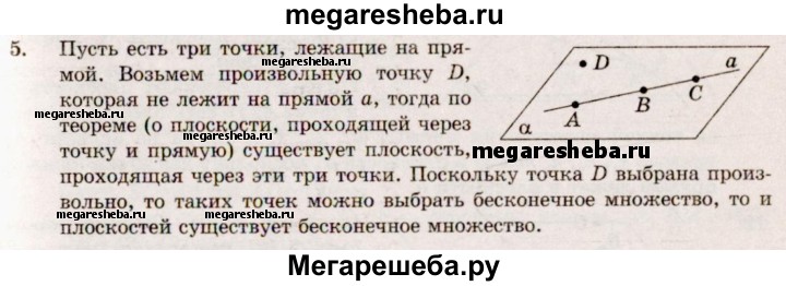 5. Докажите, что через три данные точки, лежащие на прямой, проходит плоскость. Сколько существует таких плоскостей?