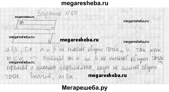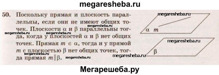 50. Плоскости α и β параллельны, прямая m лежит в плоскости α. Докажите, что прямая m параллельна плоскости β.