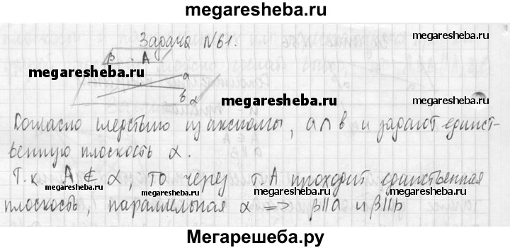 61. Даны две пересекающиеся прямые а и b и точка А, не лежащая в плоскости этих прямых. Докажите, что через точку А проходит плоскость, параллельная прямым а и b, и притом только одна.