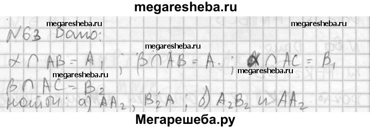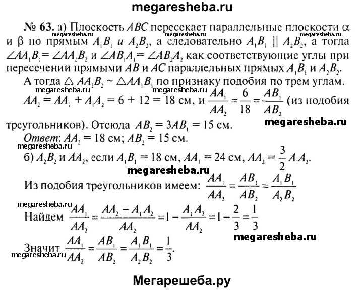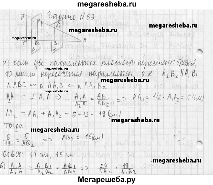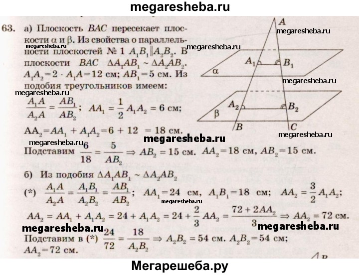 63. Параллельные плоскости α и β пересекают сторону АВ угла ВАС соответственно в точках А₁, и А₂, а сторону АС этого угла — соответственно в точках B₁ и В₂. Найдите: а) АА₁ и АВ₂, если А₁А₂ = 2А₁А = 12 см, АВ₂ = 5 см; б) А₂В₂ и АА₂, если = A₁B₁=18 см, АА₁ = 24 см , АA₂ 3/2 A₁A₂.