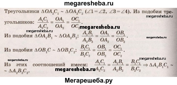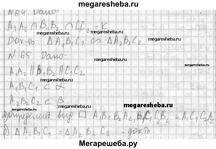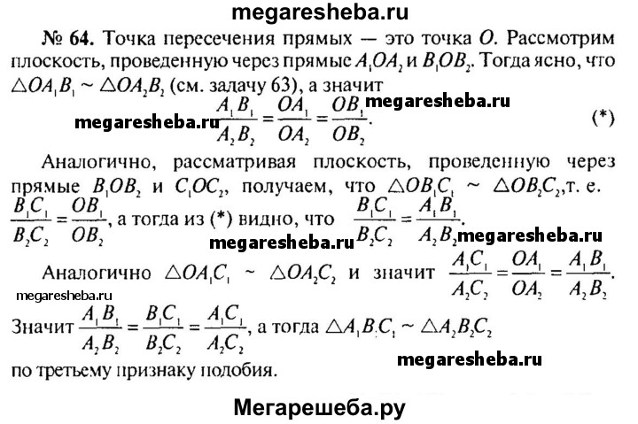 64. Три прямые, проходящие через одну точку и не лежащие в одной плоскости, пересекают одну из параллельных плоскостей в точках A₁, B₁ и С₁, а другую — в точках А₂, В₂ и С₂. Докажите, что треугольники A₁В₁C₁ и А₂В₂С₂ подобны.