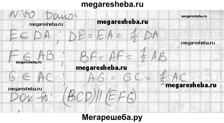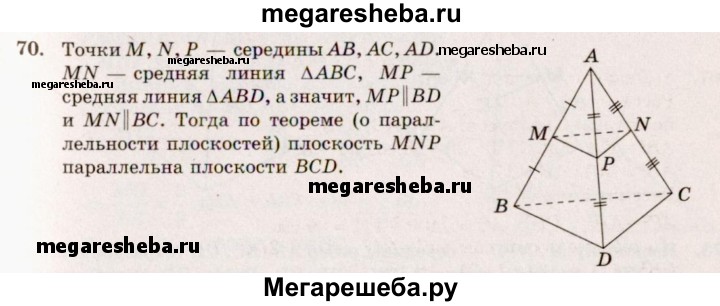 70. Докажите, что плоскость, проходящая через середины ребер АВ, АС и AD тетраэдра ABCD, параллельна плоскости BCD.