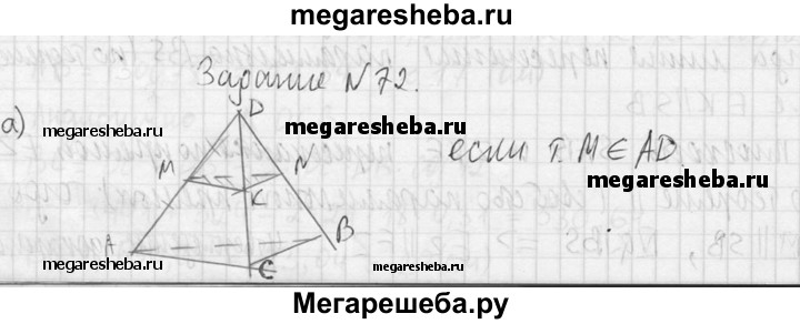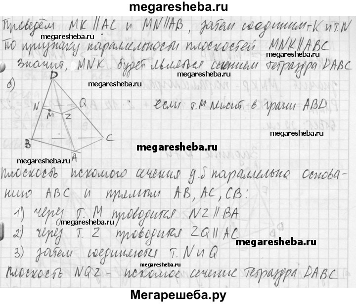 72. Изобразите тетраэдр DABC и постройте сечение этого тетраэдра плоскостью, проходящей через точку М параллельно плоскости грани ABC, если: а) точка М является серединой ребра AD; б) точка М лежит внутри грани ABD.