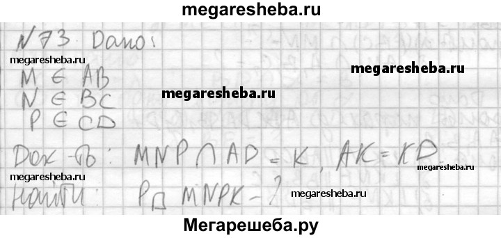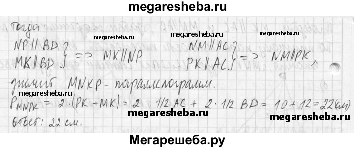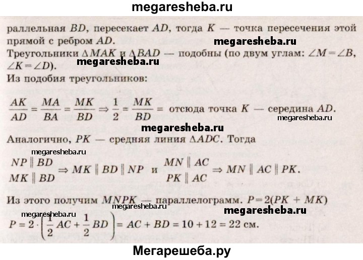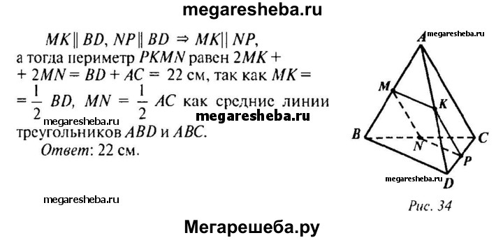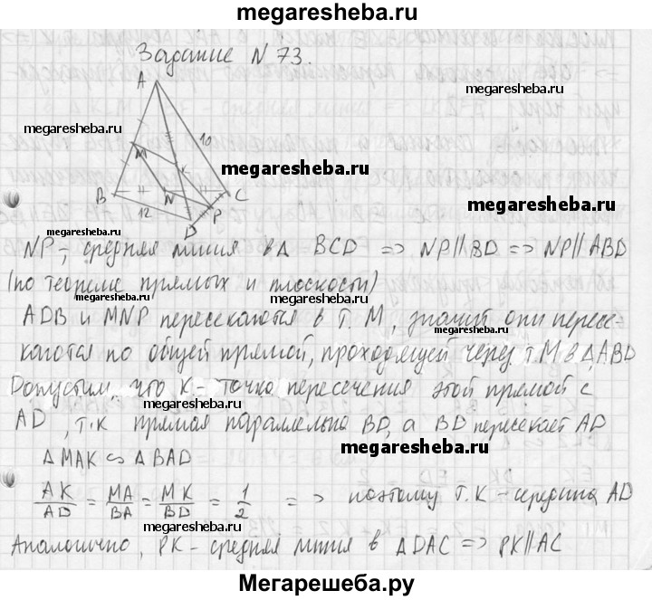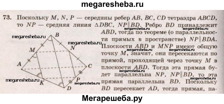 73. В тетраэдре ABCD точки М, N и Р являются серединами ребер АВ, ВС и CD, АС = 10 см, BD = 12 см. Докажите, что плоскость MNP проходит через середину К ребра AD, и найдите периметр четырехугольника, полученного при пересечении тетраэдра с плоскостью MNP.
