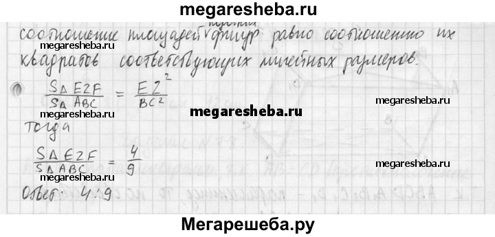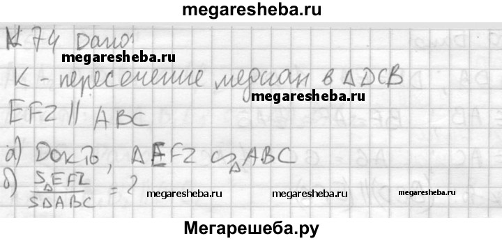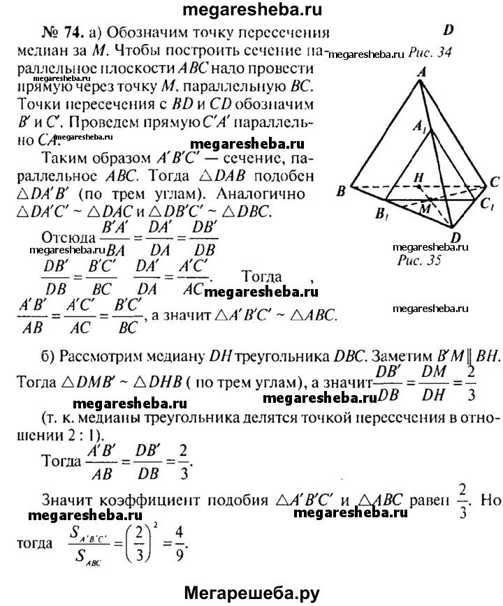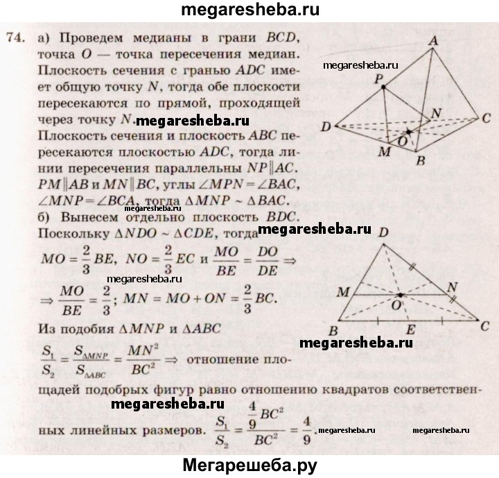 74. Через точку пересечения медиан грани BCD тетраэдра ABCD проведена плоскость, параллельная грани ABC. а) Докажите, что сечение тетраэдра этой плоскостью есть треугольник, подобный треугольнику ABC. б) Найдите отношение площадей сечения и треугольника ABC.