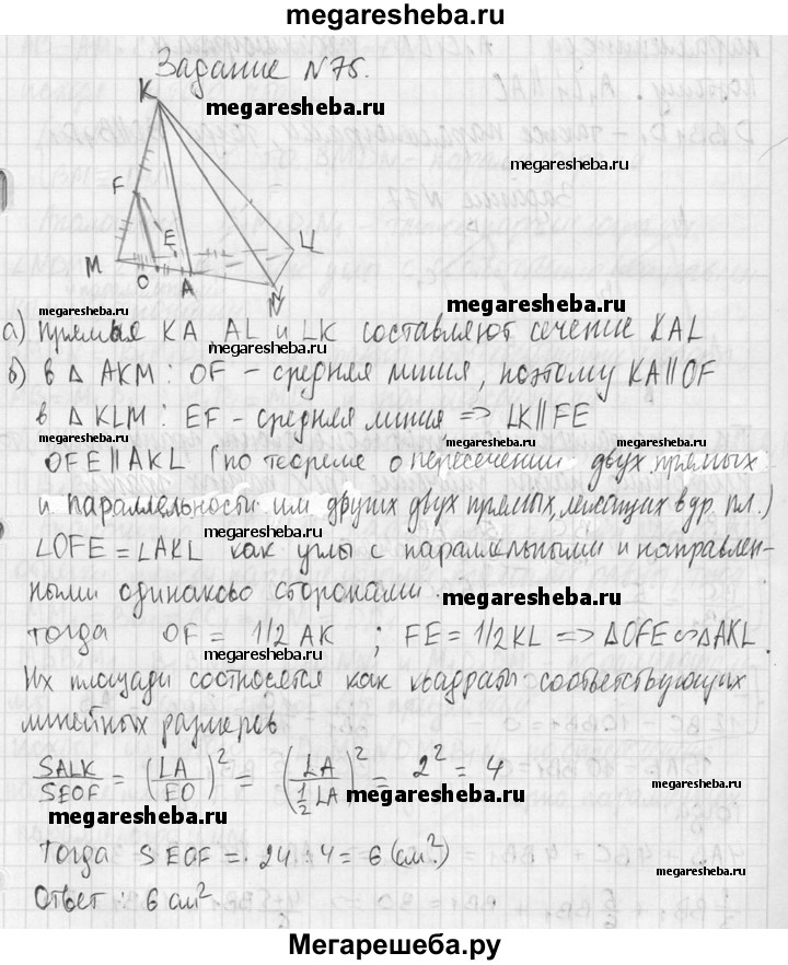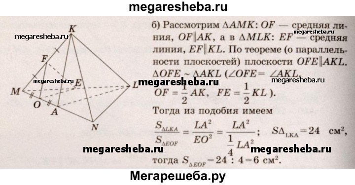 75. Изобразите тетраэдр KLMN. а) Постройте сечение этого тетраэдра плоскостью, проходящей через ребро KL и середину А ребра MN. б) Докажите, что плоскость, проходящая через середины Е, О и F отрезков LM, МА и МК, параллельна плоскости LKA. Найдите площадь треугольника EOF, если площадь треугольника LKA равна 24 см².