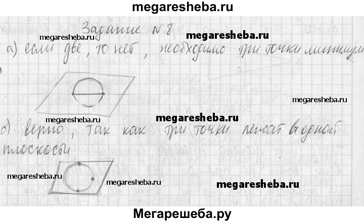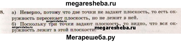 8. Верно ли утверждение: а) если две точки окружности лежат в плоскости, то и вся окружность лежит в этой плоскости; б) если три точки окружности лежат в плоскости, то и вся окружность лежит в этой плоскости?