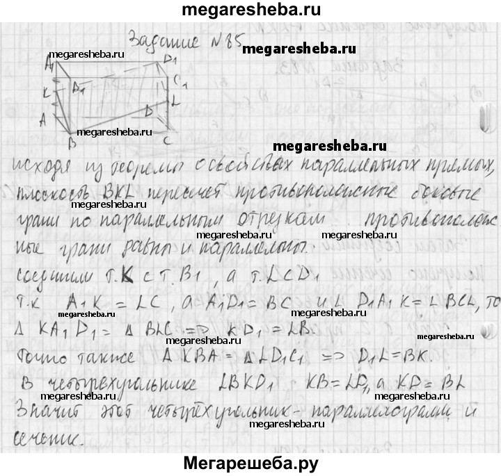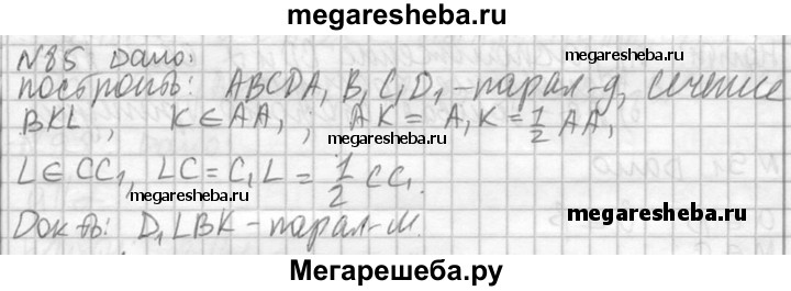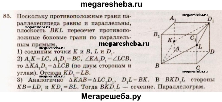 85. Изобразите параллелепипед ABCDA₁B₁С₁D₁ и постройте его сечение плоскостью BKL, где точка К — середина ребра АА₁, а точка L — середина ребра СС₁. Докажите, что построенное сечение — параллелограмм.