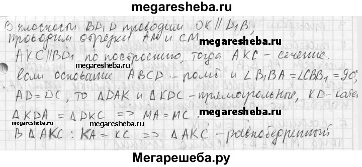 86. Изобразите параллелепипед ABCDA₁B₁C₁D₁ и постройте его сечение плоскостью, проходящей через диагональ АС основания параллельно диагонали BD₁. Докажите, что если основание параллелепипеда — ромб и углы АВВ₁ и СВВ₁ прямые, то построенное сечение — равнобедренный треугольник.