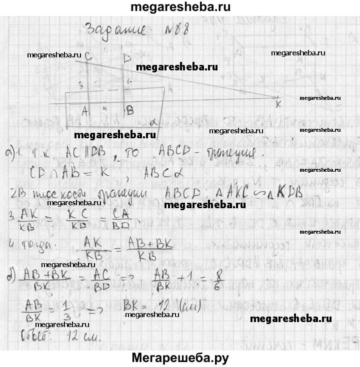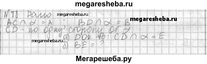 88. Параллельные прямые АС и BD пересекают плоскость α в точках А и В. Точки С и D лежат по одну сторону от плоскости α, АС = 8 см, BD = 6 см, АВ = 4 см. а) Докажите, что прямая CD пересекает плоскость α в некоторой точке Е. б) Найдите отрезок BE.