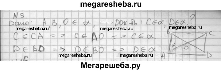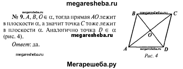 9. Две смежные вершины и точка пересечения диагоналей параллелограмма лежат в плоскости α. Лежат ли две другие вершины параллелограмма в плоскости α? Ответ обоснуйте.