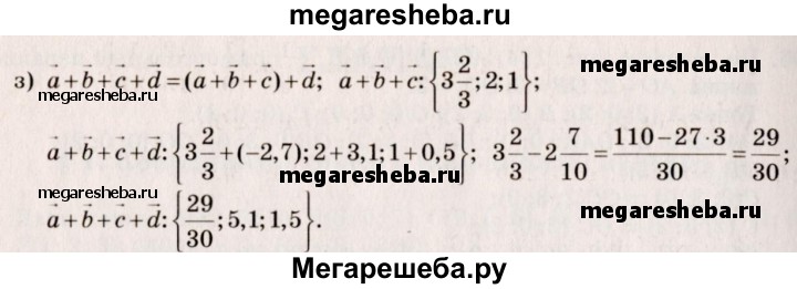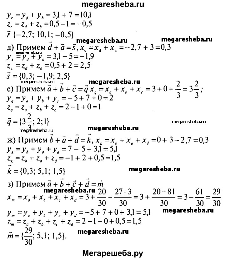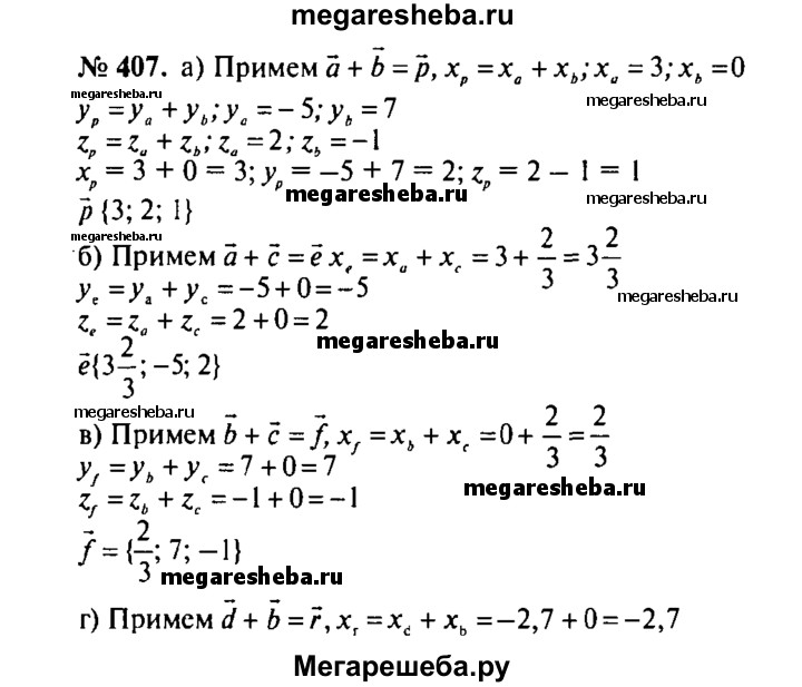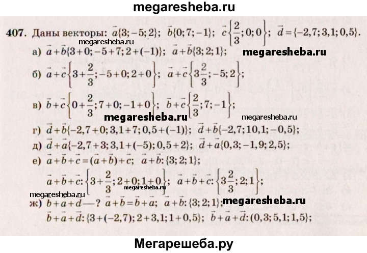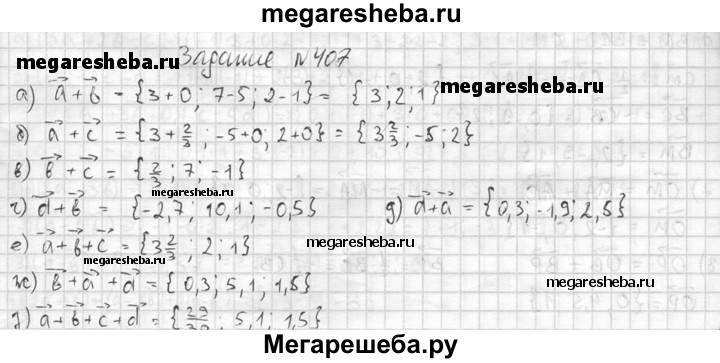 407. Даны векторы а {3; -5; 2}, b {0; 7; -1}, с {2/3;0;0 }и d {-2,7; 3,1; 0,5}. Найдите координаты векторов: а) а + b; б) а + с; в) b + с; г) d + b; д) d + а; е) а + b + с; ж) b + а + d; з) а + b + с + d.