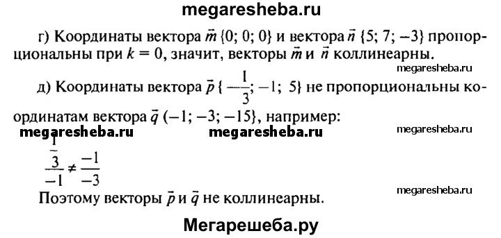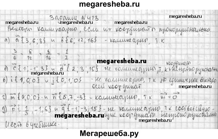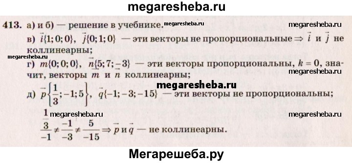 413. Коллинеарны ли векторы: а) а {3; 6; 8} и b {6; 12; 16}; б) с {1; -1; 3} и d {2; 3; 15}; в) I {1; 0; 0} и j {0; 1; 0}; г) m {0; 0; 0} и n {5; 7; -3}; д) р {1/3;-1;5} и q {-1;-3;-15}?