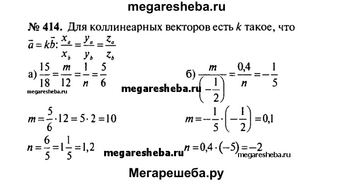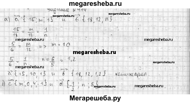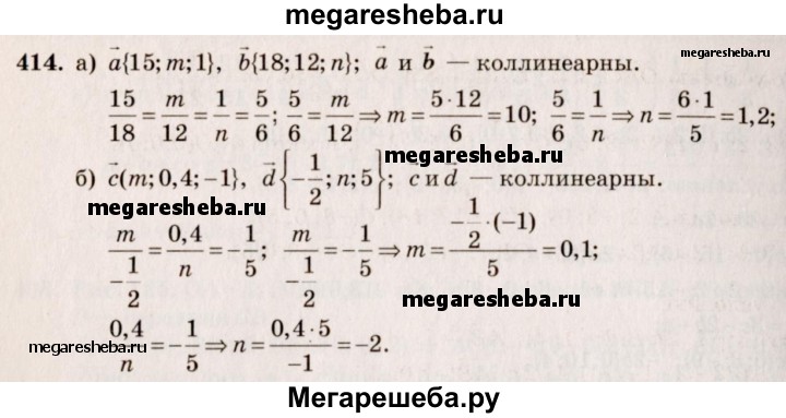 414. Найдите значения m и n, при которых следующие векторы коллинеарны: а) а {15; m; 1} и b {18; 12; n}; б) с {m; 0,4; -1} и d {-1/2; n; 5}