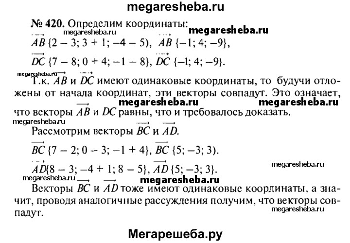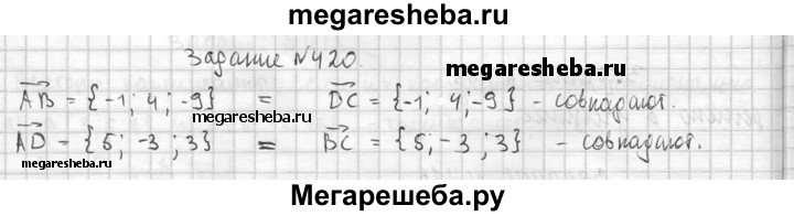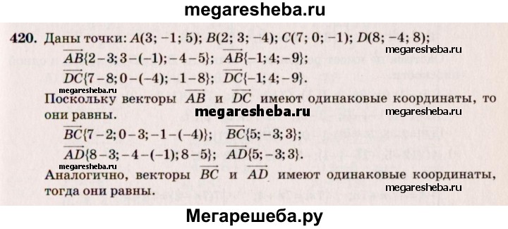 420. Даны точки А (3; -1; 5), В (2; 3; -4), С (7; 0; -1) и D (8; -4; 8). Докажите, что векторы АВ и DC равны. Равны ли векторы ВС и AD?