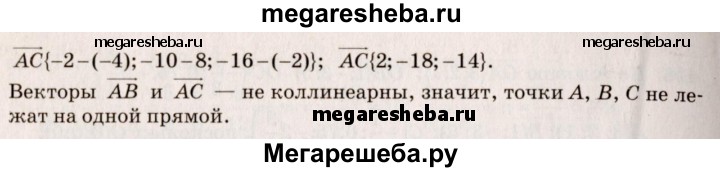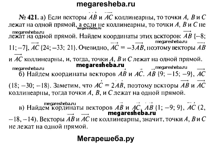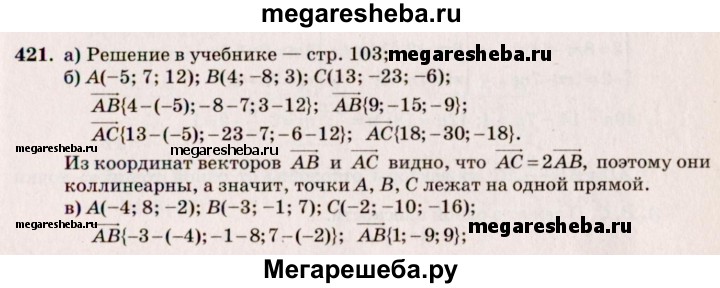 421. Лежат ли точки А, В и С на одной прямой, если: а) А (3; -7; 8), В (-5; 4; 1), С (27; -40; 29); б) А (-5; 7; 12), В (4; -8; 3), С (13; -23; -6); в) А (-4; 8; -2), В (-3; -1; 7), С (-2; -10; -16)?