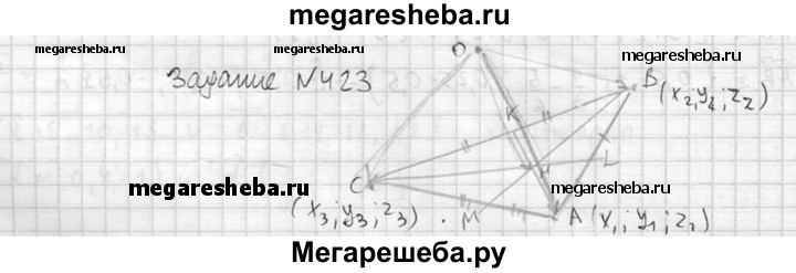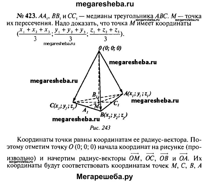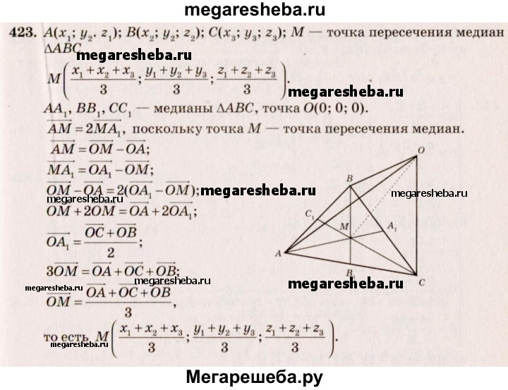 423. Докажите, что точка пересечения медиан треугольника ABC с вершинами А (х₁; у₁; z₁), В (х₂; у₂, z₂), С (х₃; у₃; z₃) имеет координаты( x₁+x₂+x₃/3 ; y₁+y₂+y₃/3; z₁+z₂+z₃/3 ).