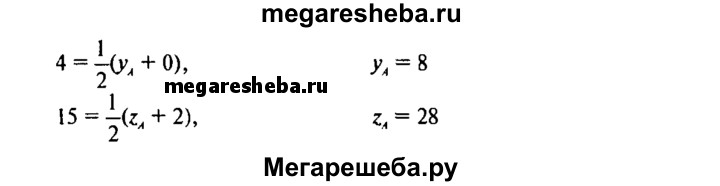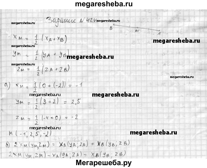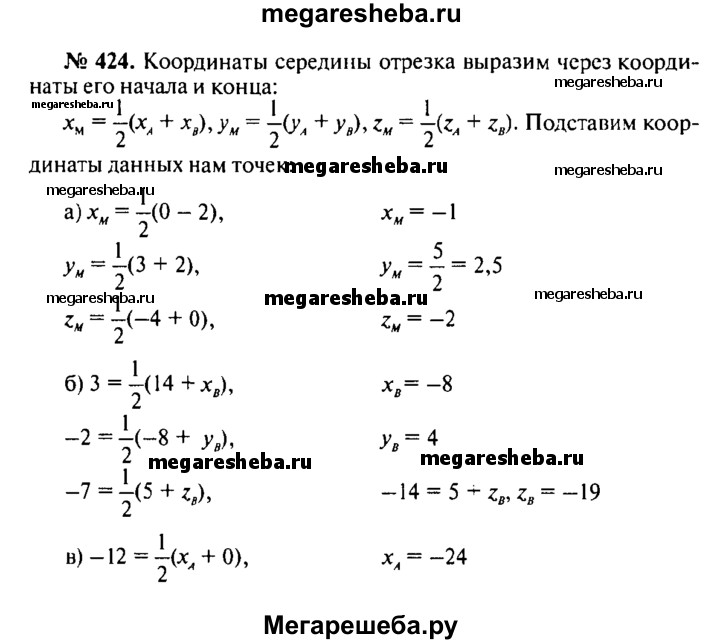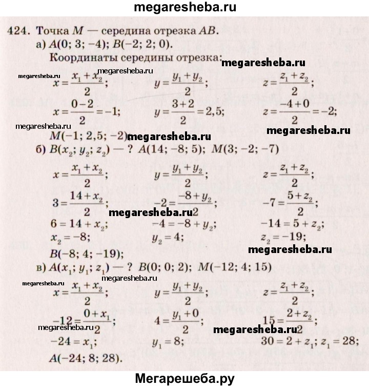 424. Точка М — середина отрезка АВ. Найдите координаты: а) точки М, если А (0; 3; -4), В (-2; 2; 0); б) точки В, если А (14; -8; 5), М (3; -2; -7); в) точки А, если В (0; 0; 2), М (-12; 4; 15).