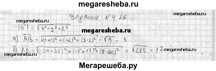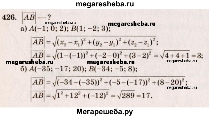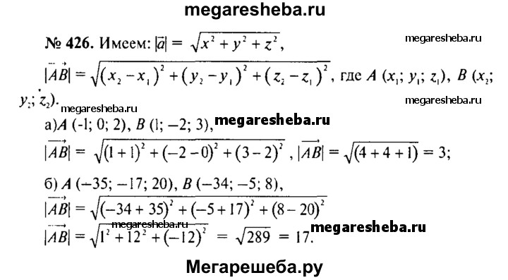 426. Найдите длину вектора АВ, если: а) А(-1; 0; 2), В(1; -2; 3); б) А(-35; -17; 20), В(-34; -5; 8).