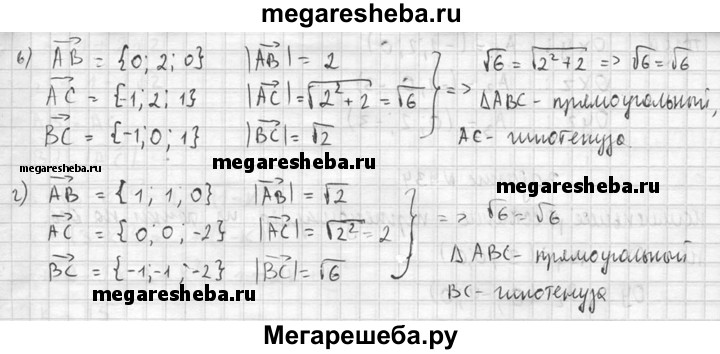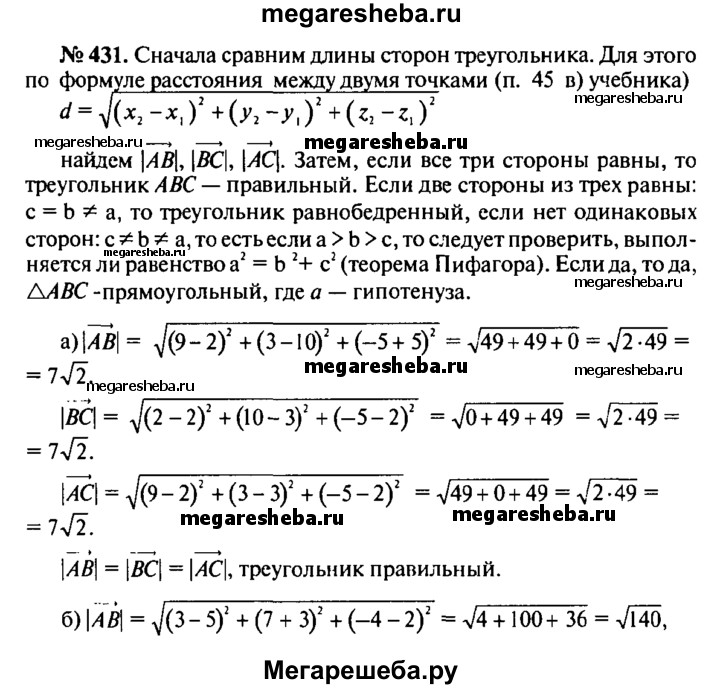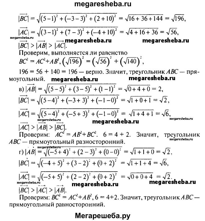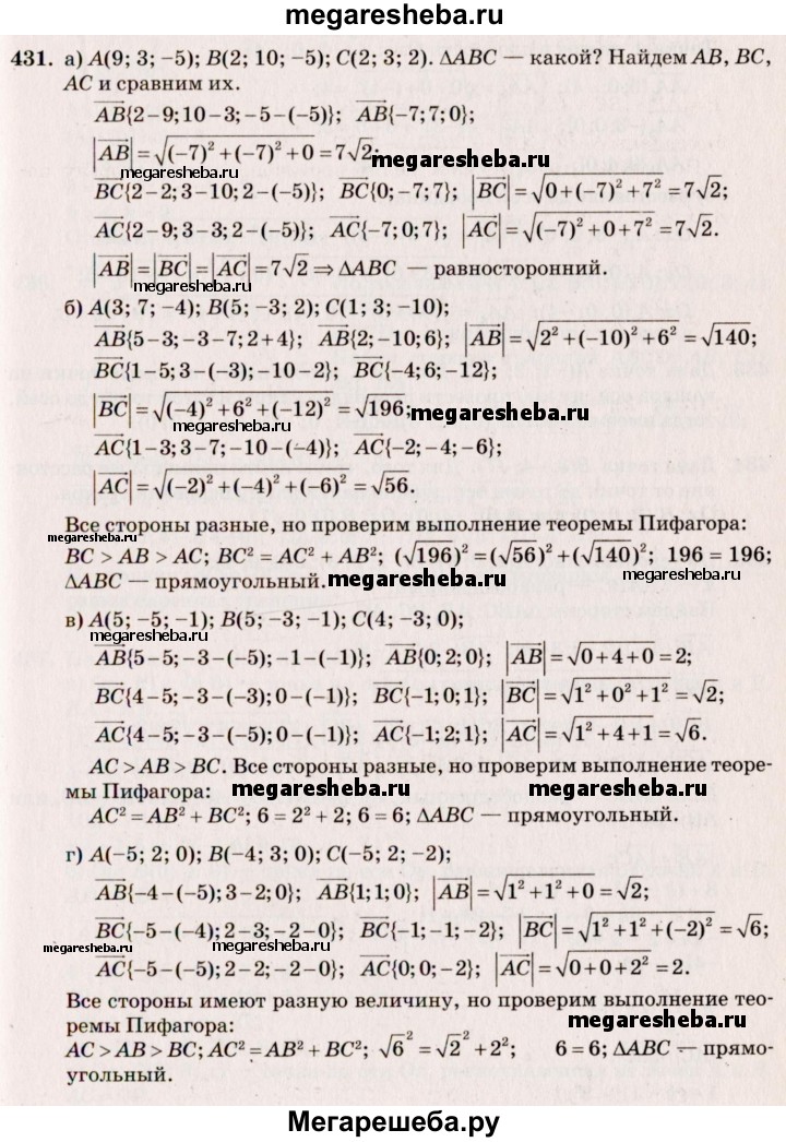 431. Определите вид треугольника ABC, если: а) А (9; 3; -5), В (2; 10; -5), С (2; 3; 2); б) А(3; 7; -4), В (5; -3; 2), С(1; 3; -10); в) А (5; -5; -1), В (5; -3; -1), С (4; -3; 0); г) А (-5; 2; 0), В (-4; 3; 0), С (-5; 2; -2).
