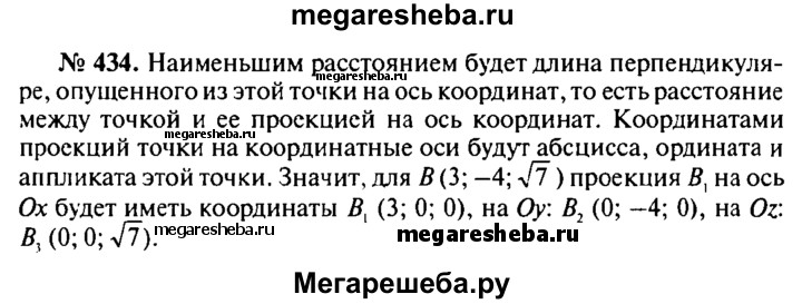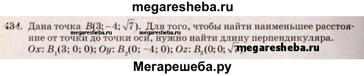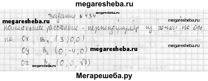 434. На каждой из осей координат найдите такую точку, расстояние от которой до точки В (3; -4; √7) является наименьшим среди всех расстояний от точек этой оси до точки В.