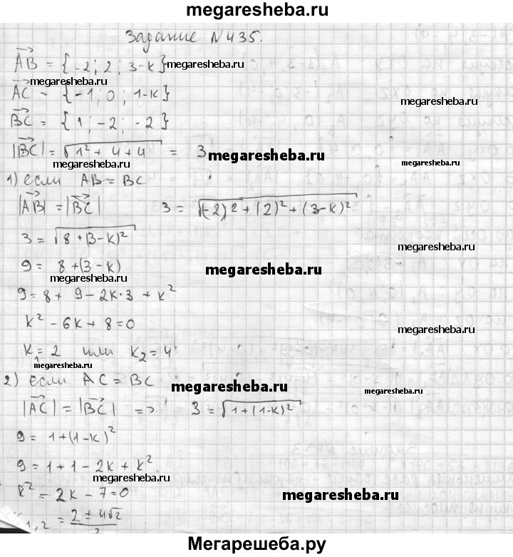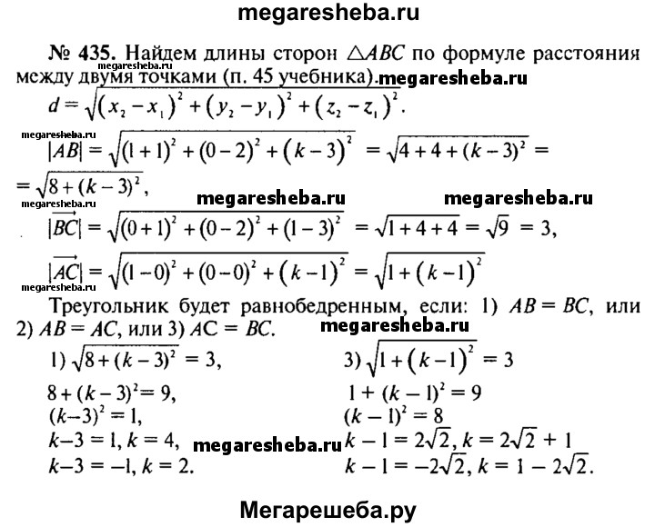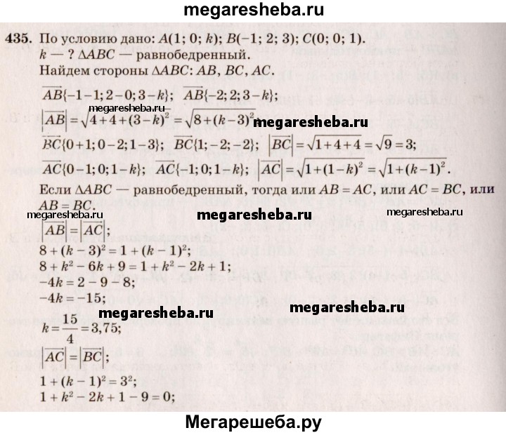 435. Даны точки А(1; 0; k), В(-1; 2; 3) и С (0; 0; 1). При каких значениях k треугольник ABC является равнобедренным?