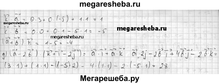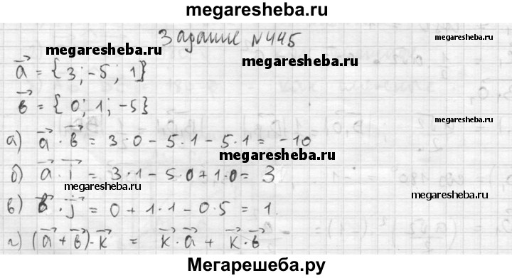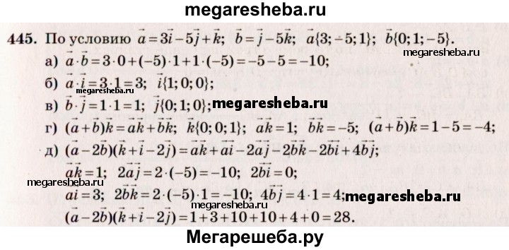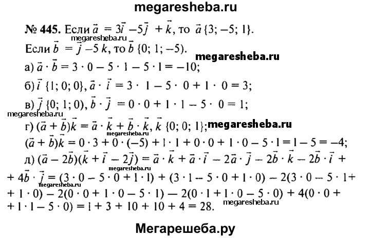 445. Даны векторы а = 3i – 5j + k и b = j - 5k. Вычислите: a) вектор ab; б) вектор ai; в) вектор bj; г) вектор (a + b)k; д) вектор (а – 2b) (k + i- 2j).