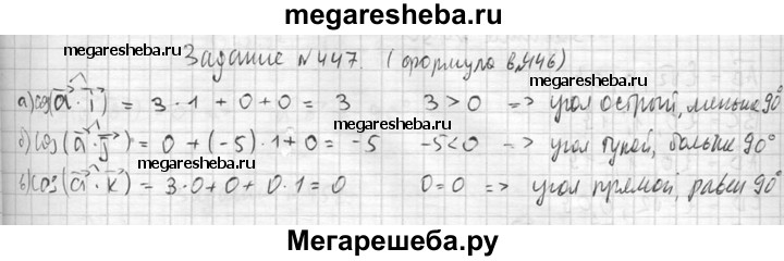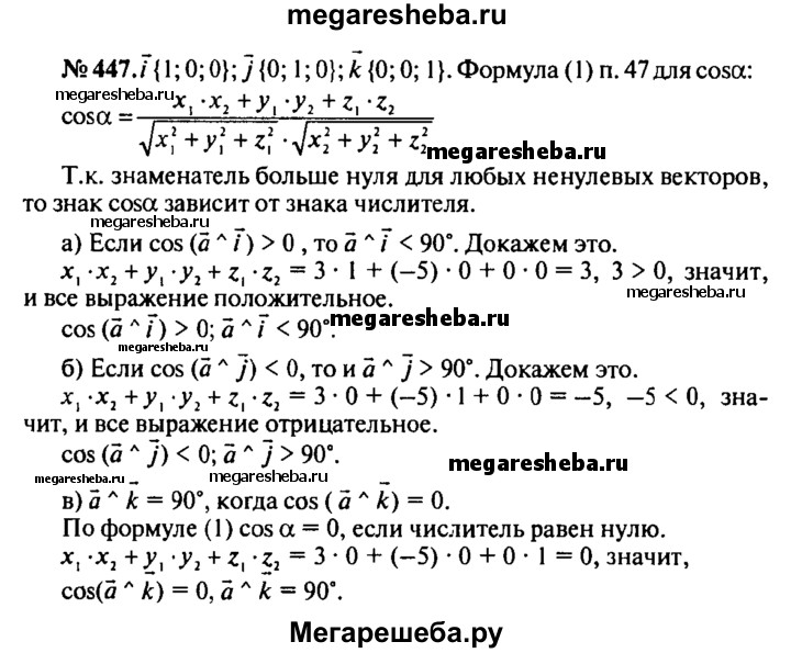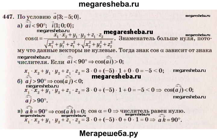 447. Дан вектор а {3; -5; 0}. Докажите, что: а) угол векторов ai < 90°; б) угол векторов аj > 90°; в) угол векторов ak = 90°.