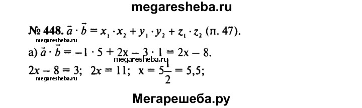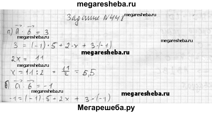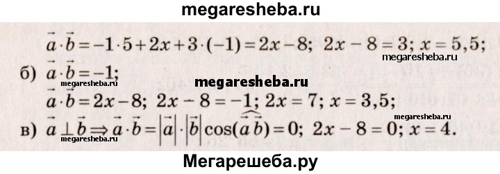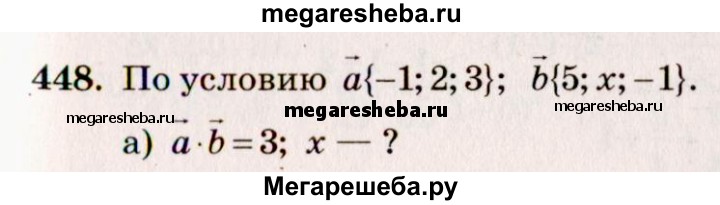 448. Даны векторы а {-1; 2; 3} и b{5; х; -1}. При каком значении х выполняется условие: a) вектор ab = 3; б) вектор ab = -1; в) вектор a перпендикулярен вектору b?