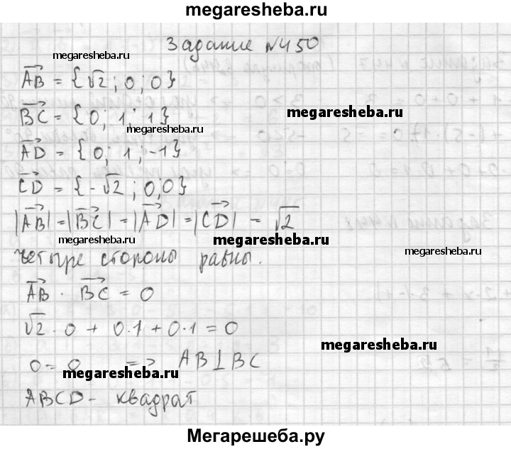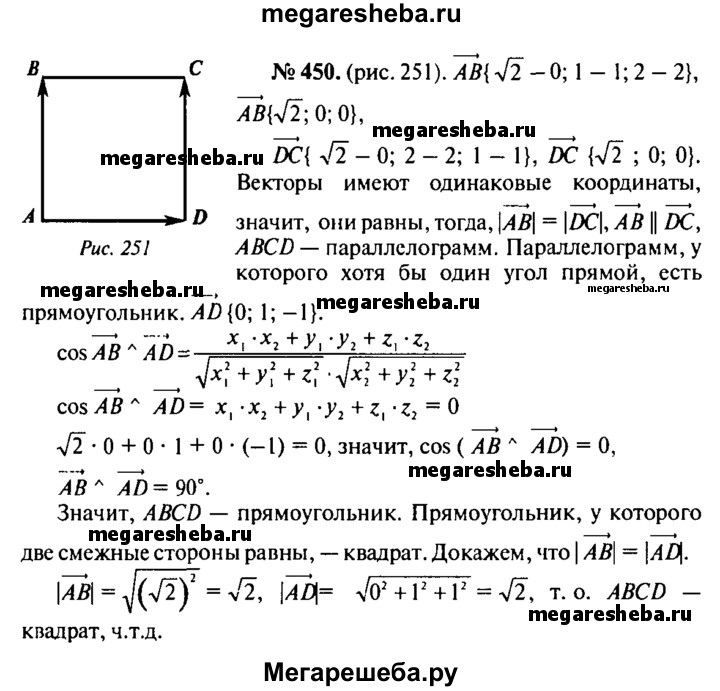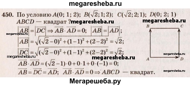 450. Даны точки А (0; 1; 2), В (√2; 1; 2), С (√2; 2; 1) и D (0; 2; 1). Докажите, что ABCD — квадрат.