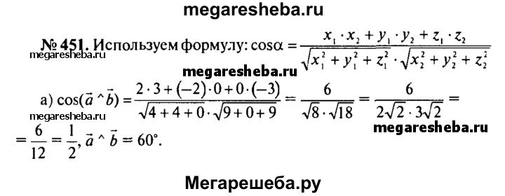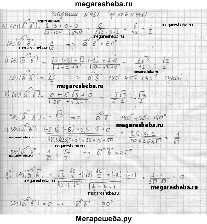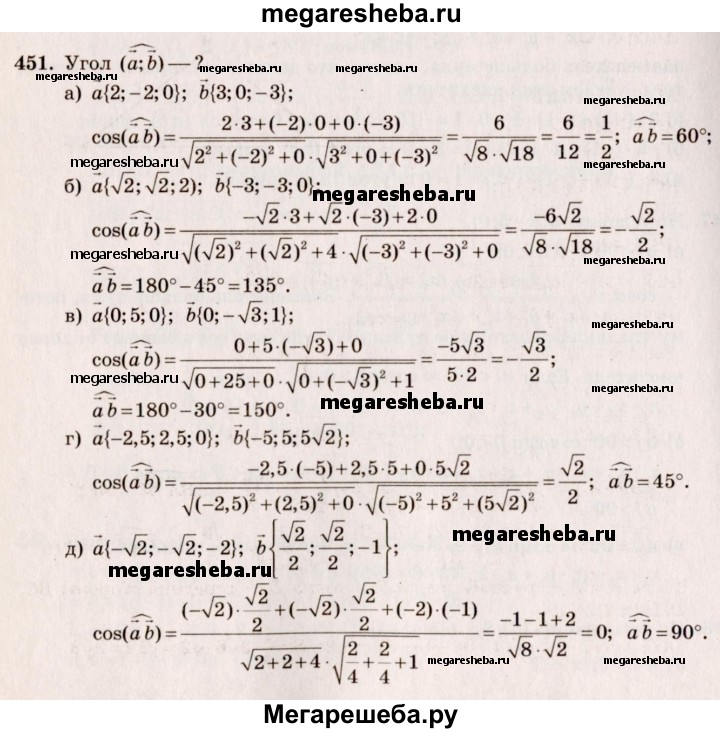 451 Вычислите угол между векторами: а) вектор а{2;-2;0} и вектор b {3; 0;-3}; б) вектор а { √2; √2; 2} и вектор b {-3;-3; 0}; в) вектор а {0; 5; 0} и вектор b {0;- √3; 1}; г) вектор а {-2,5; 2,5; 0} и вектор b {-5; 5; 5 √2}; д) вектор а {- √2; - √2; -2} и вектор b { √2/2; √2/2; -1}.