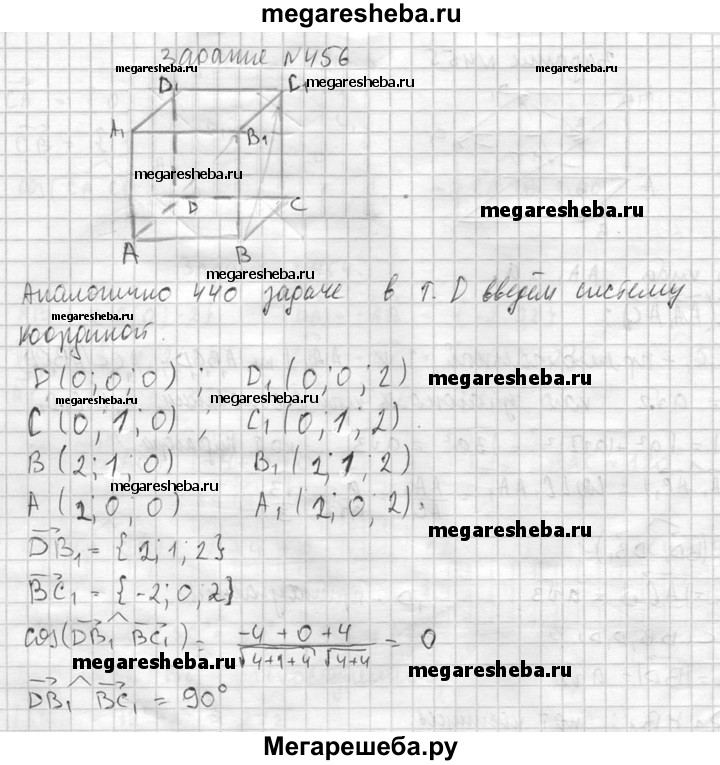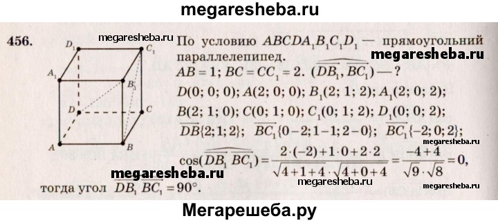 456. Дан прямоугольный параллелепипед ABCDA₁B₁C₁D₁, в котором АВ = 1, ВС = CC₁ = 2. Вычислите угол между векторами DB₁ и ВС₁.