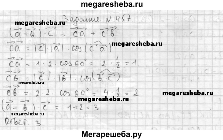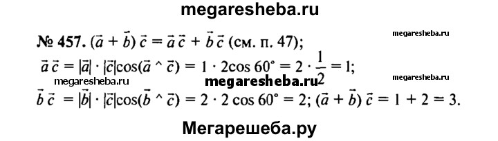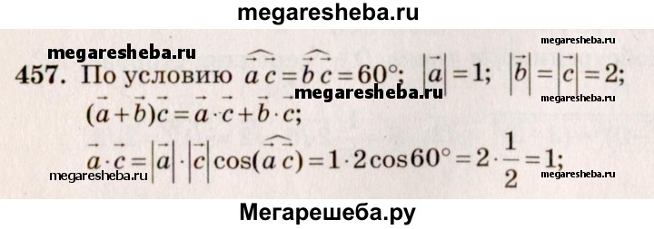 457. Известно, что угол векторов ас =bс = 60°, | вектор а | = 1, | вектор b | = |вектру с | = 2. Вычислите ( вектор а +вектор b)вектор с.