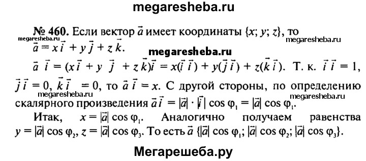 460. Докажите, что координаты ненулевого вектора в прямоугольной системе координат равны {| a | cos ф₁; | вектор a| cos ф₂; |вектор a|cos ф₃}, где ф₁ =угол векторов аi, ф₂= углу векторов aj, ф₃= углу векторов аk.
