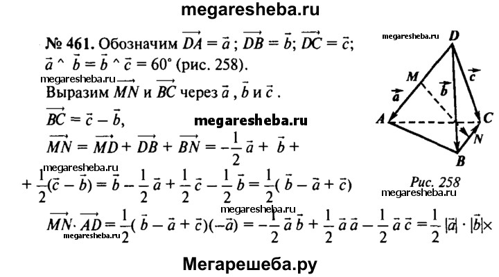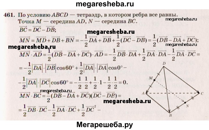 461. Все ребра тетраэдра ABCD равны друг другу. Точки М и N — середины ребер AD и ВС. Докажите, что вектора MN AD = MN ВС = 0.
