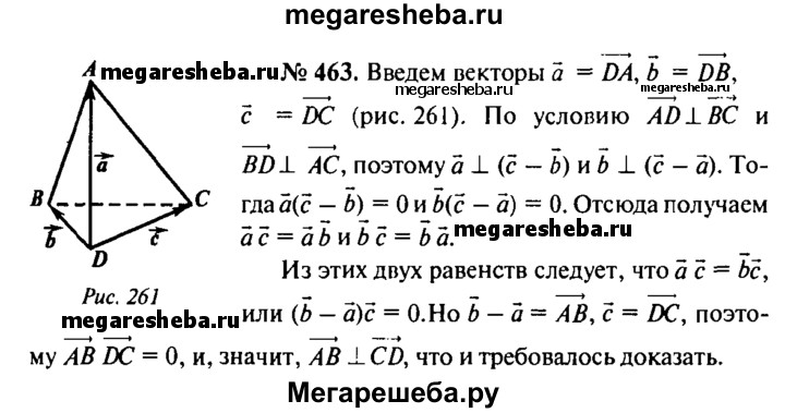 463. В тетраэдре ABCD противоположные ребра AD и ВС, а также BD и АС перпендикулярны. Докажите, что противоположные ребра CD и АВ также перпендикулярны.
