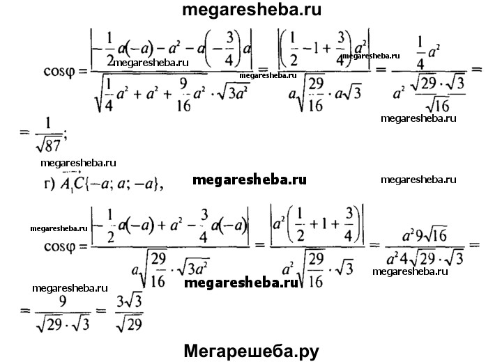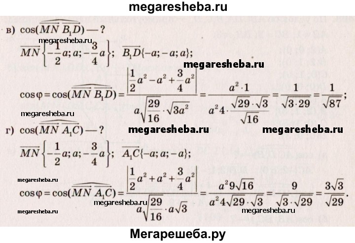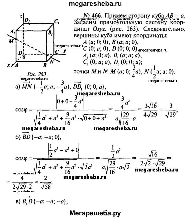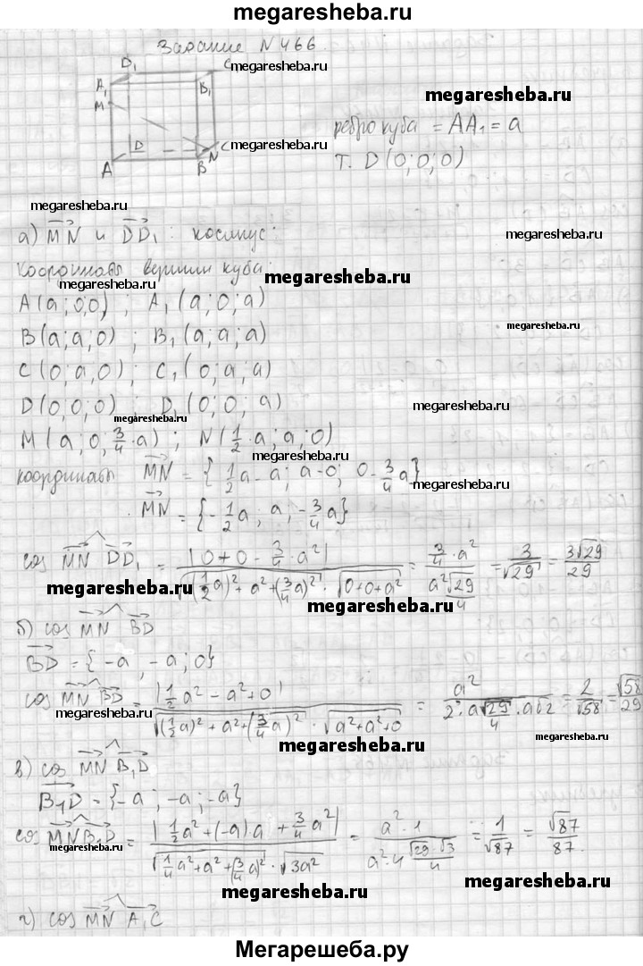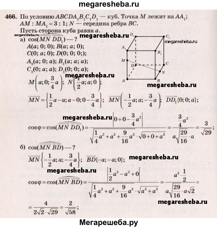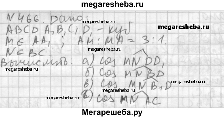 466. В кубе ABCDA₁B₁C₁D₁ точка М лежит на ребре AA₁, причем AM : MA₁ = 3 : 1, а точка N — середина ребра ВС. Вычислите косинус угла между прямыми: а) MN и DD₁; б) MN и BD; в) MN и B₁D г) MN и А₁С.