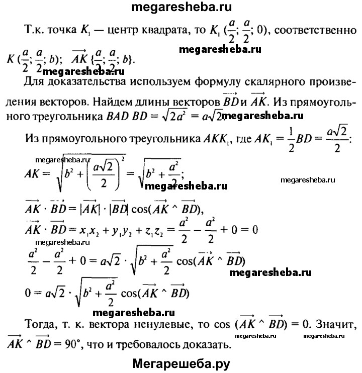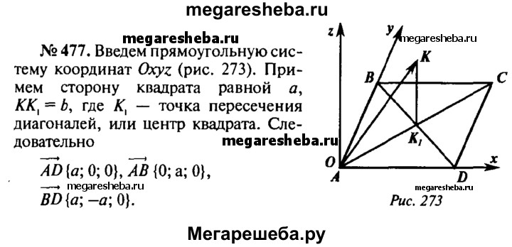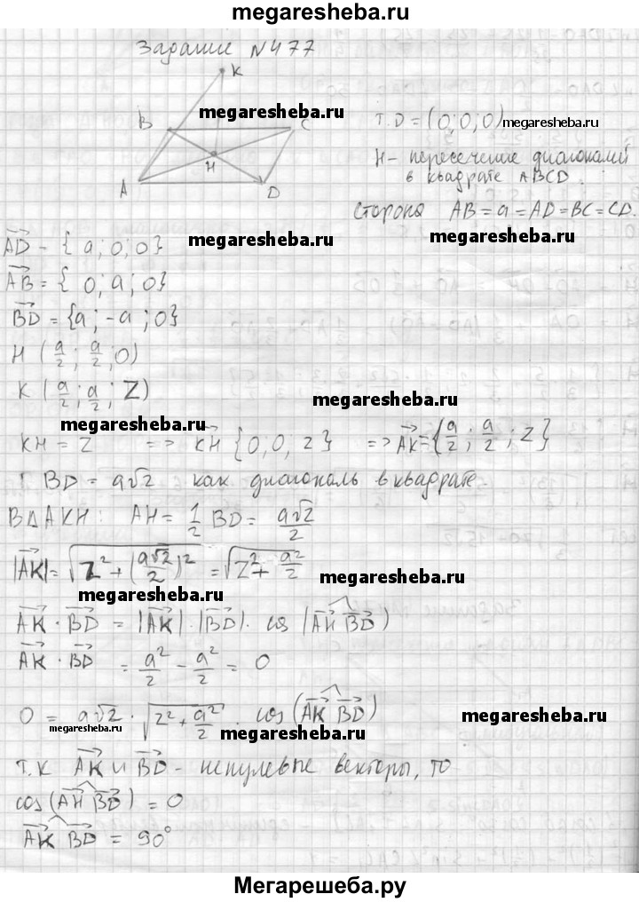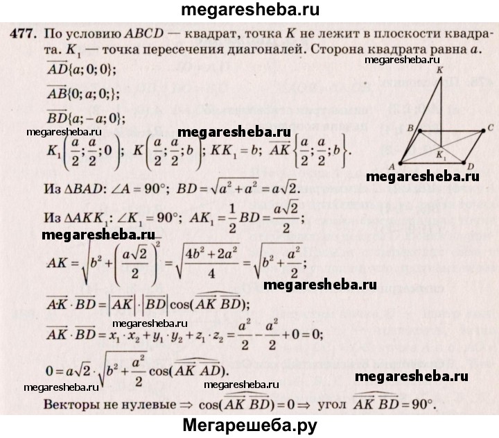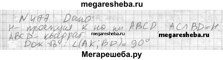 477. Проекция точки К на плоскость квадрата ABCD совпадает с центром этого квадрата. Докажите, что угол между прямыми АК и BD равен 90°.
