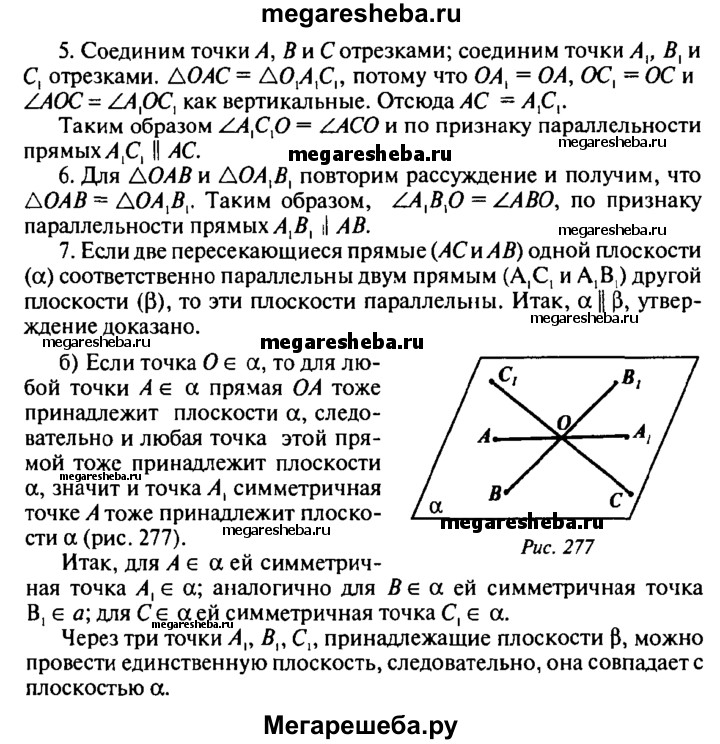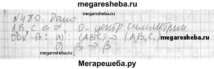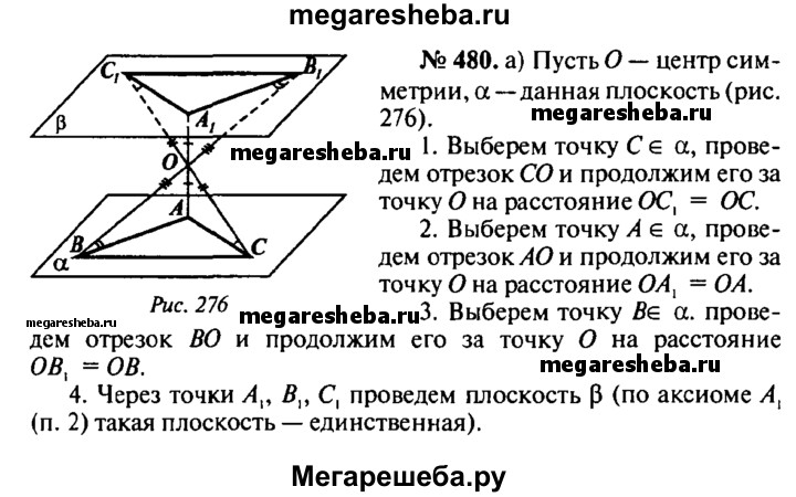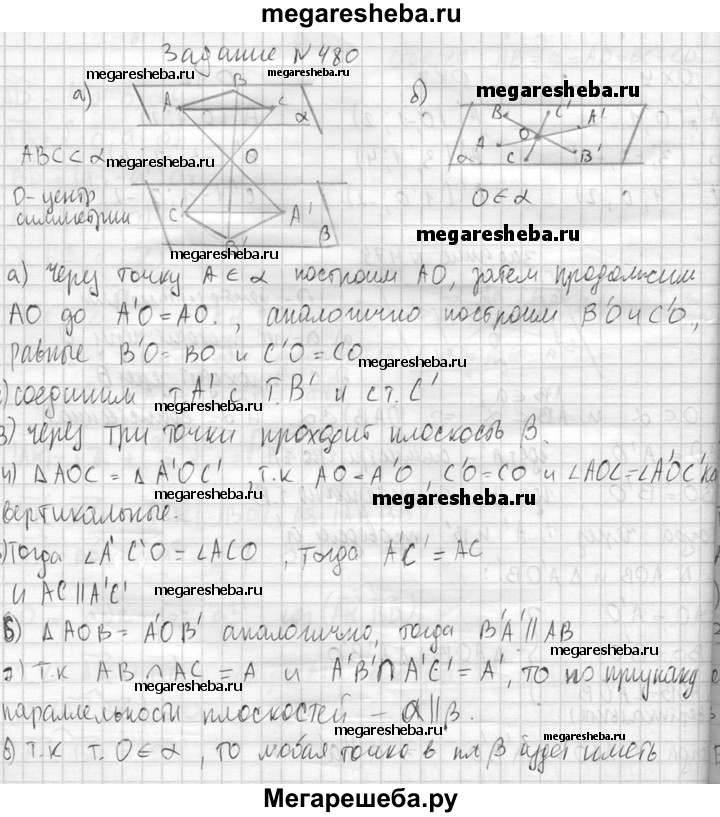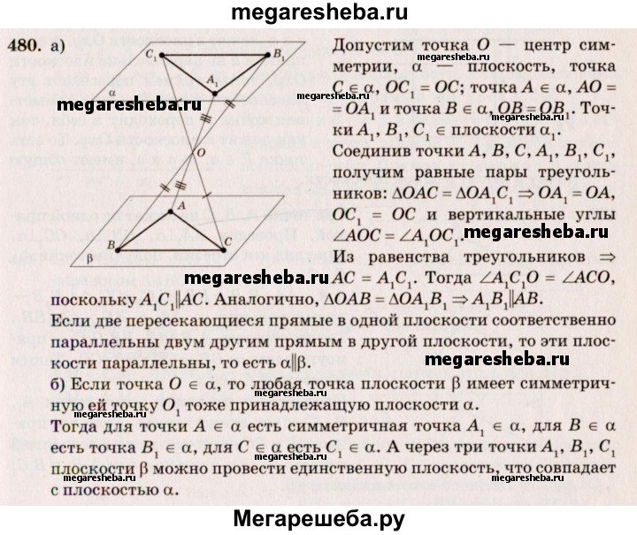 480. Докажите, что при центральной симметрии: а) плоскость, не проходящая через центр симметрии, отображается на параллельную ей плоскость; б) плоскость, проходящая через центр симметрии, отображается на себя.