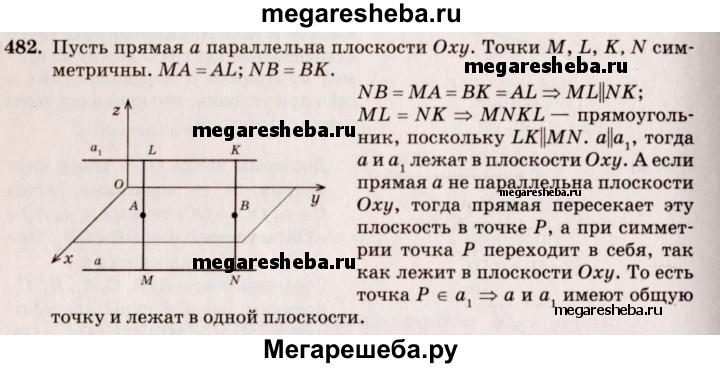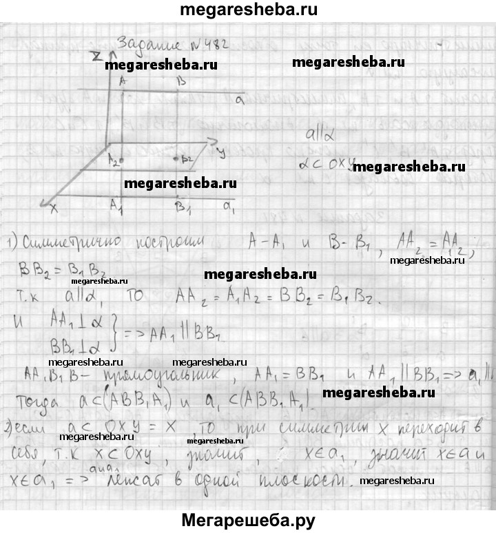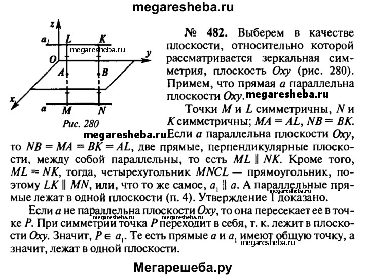 482. При зеркальной симметрии прямая а отображается на прямую а₁ Докажите, что прямые а и а₁ лежат в одной плоскости.