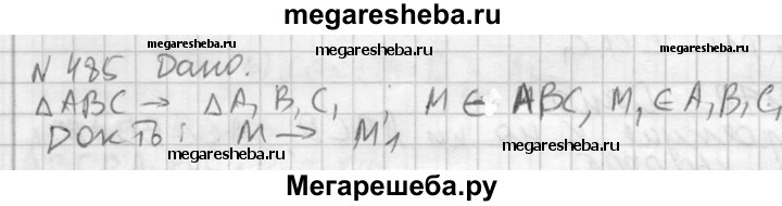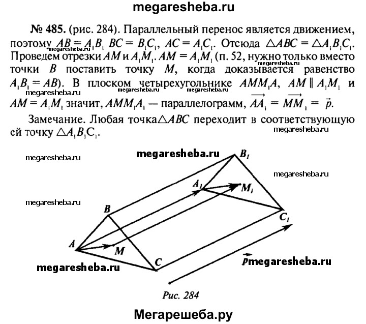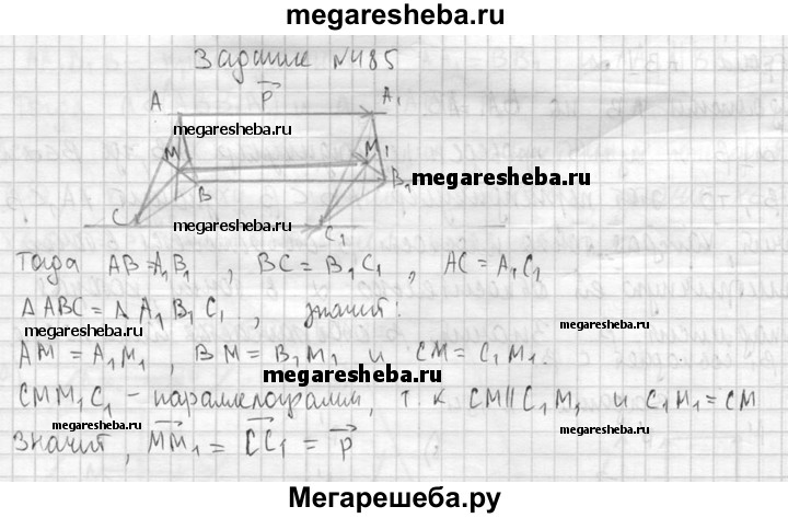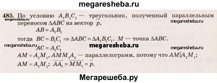 485. Треугольник A₁B₁C₁ получен параллельным переносом треугольника ABC на вектор р. Точки M₁ и М — соответственно точки пересечения медиан треугольников A₁B₁C₁ и ABC. Докажите, что при параллельном переносе на вектор р точка М переходит в точку М₁.